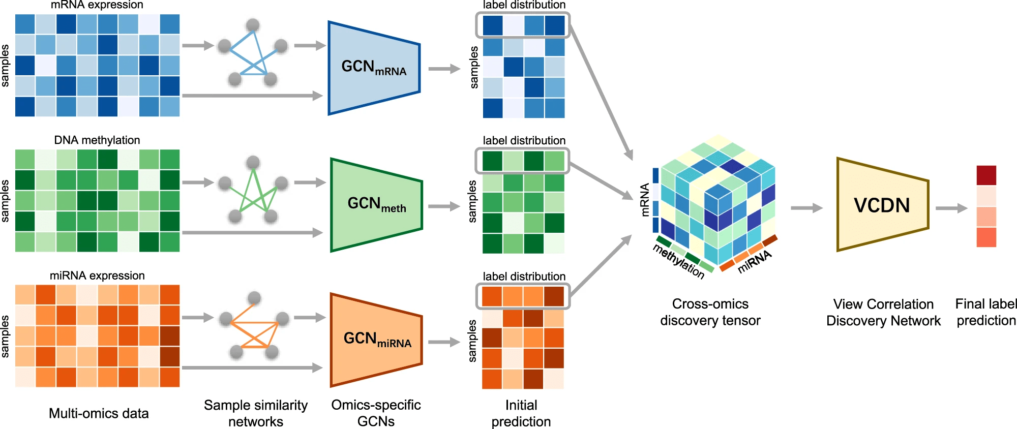 MOGONET combines GCN for multi-omics-specific learning and VCDN for multi-omics integration. For clear and concise illustration, an example of one sample is chosen to demonstrate the VCDN component for multi-omics integration. Preprocessing is first performed on each omics data type to remove noise and redundant features. Each omics-specific GCN is trained to perform class prediction using omics features and the corresponding sample similarity network generated from the omics data. The cross-omics discovery tensor is calculated from the initial predictions of omics-specific GCNs and forwarded to VCDN for final prediction. MOGONET is an end-to-end model and all networks are trained jointly.
