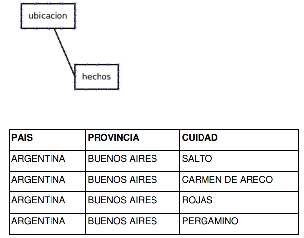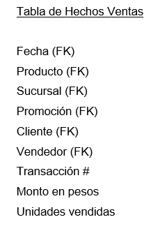 La tabla de hechos es la central, que contiene todos los datos medibles y también una clave foránea a cada tabla de dimensión que describen los hechos.