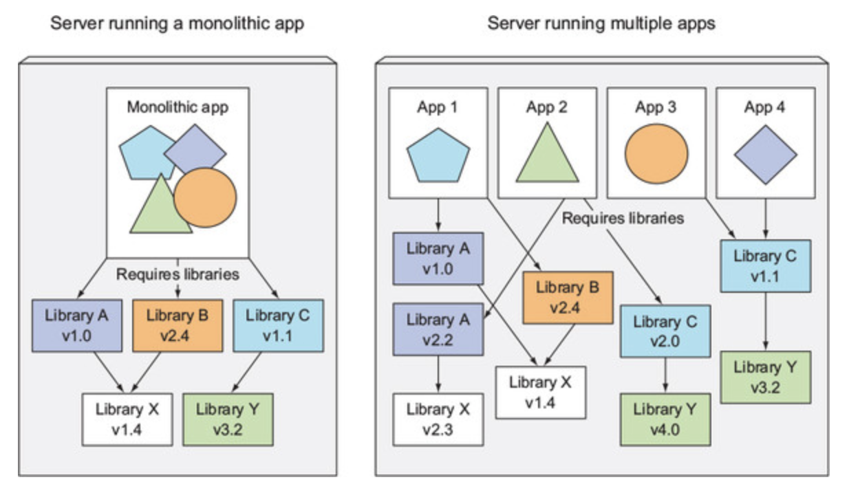 Before containers went mainstream, we isolate components using Virtual Machine (VM). This way, each components can have their own dependencies satisfied without getting in the way of each other.
