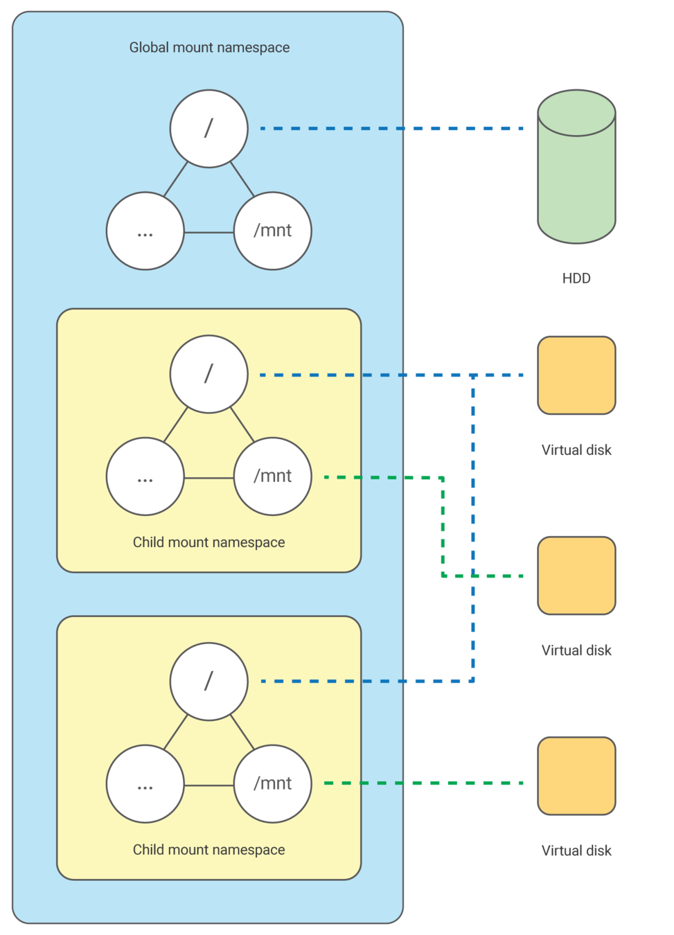 Linux maintains a data structure for all the mount points of the system. It includes information like what disk partitions are mounted, where they are mounted, whether they are readonly, etc. With Linux namespaces, one can have this data structure cloned, so that processes under different namespaces can change the mount points without affecting each other.