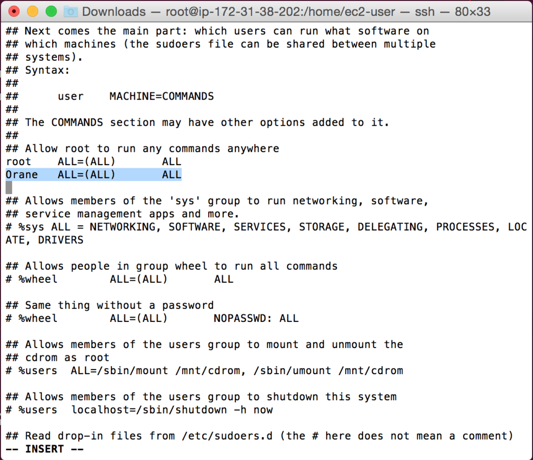 Now add the user to sudoer’s list by running $ visudo press enter, search for [root ALL = (ALL) ALL] and add [<username> ALL = (ALL) ALL] below it. (see screenshot on next page).