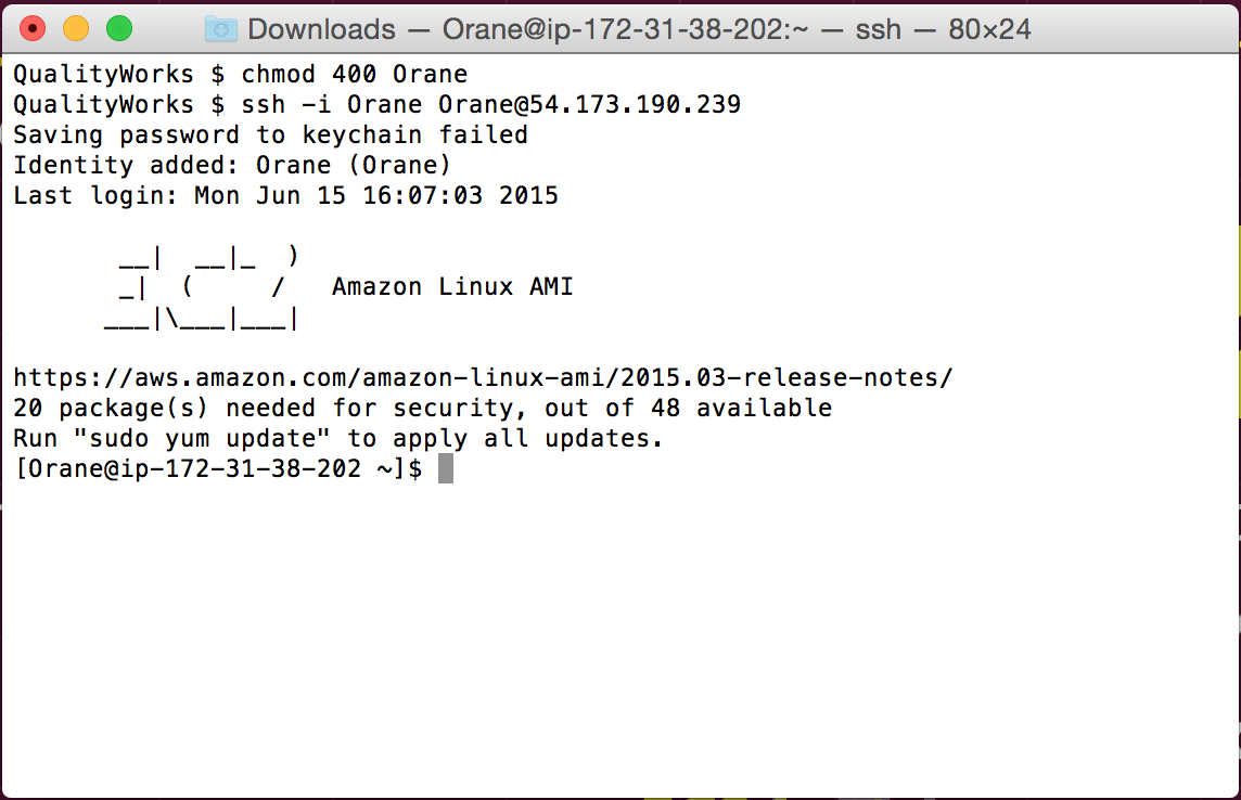 $ ssh -i <key_just_created> <username>@<yourElasticIP> to access your AWS Server.