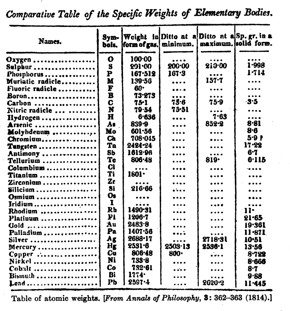 - 1826: Mediante sus métodos determina la composición correcta de las sustancias más comunes logrando construir una tabla de pesos atómicos.