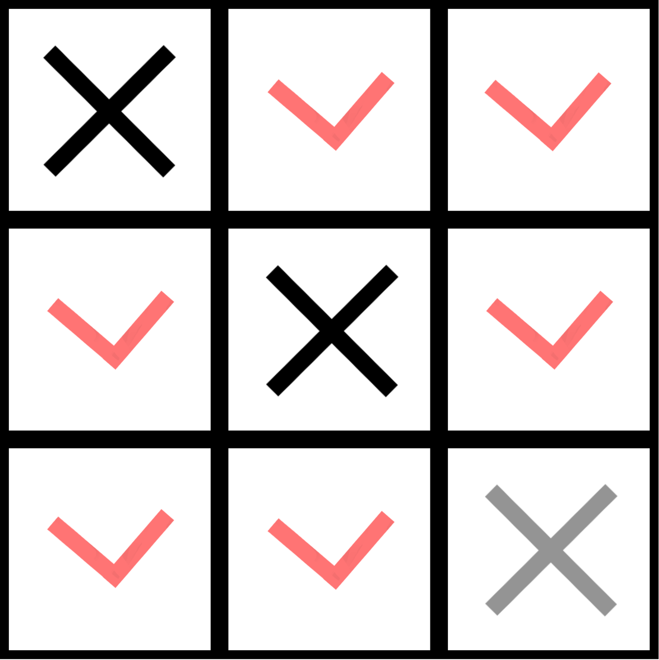 (X가 선을 그릴 수 있는 패턴 수 * 체크 표시를 선택하는 대신 지울 수 있는 패턴의 수 * 체크 표시 중 하나를 고를 경우의 수 * X를 표시할 경우의 수)