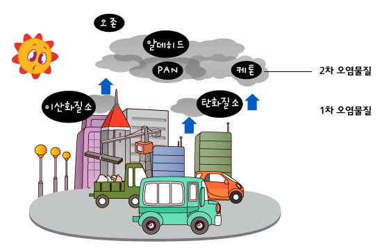 2차 오염 물질 : 1차 오염 물질들이 대기 중의 화합물과 화학 반응을 일으켜 새롭게 생성되는 유해한 물질