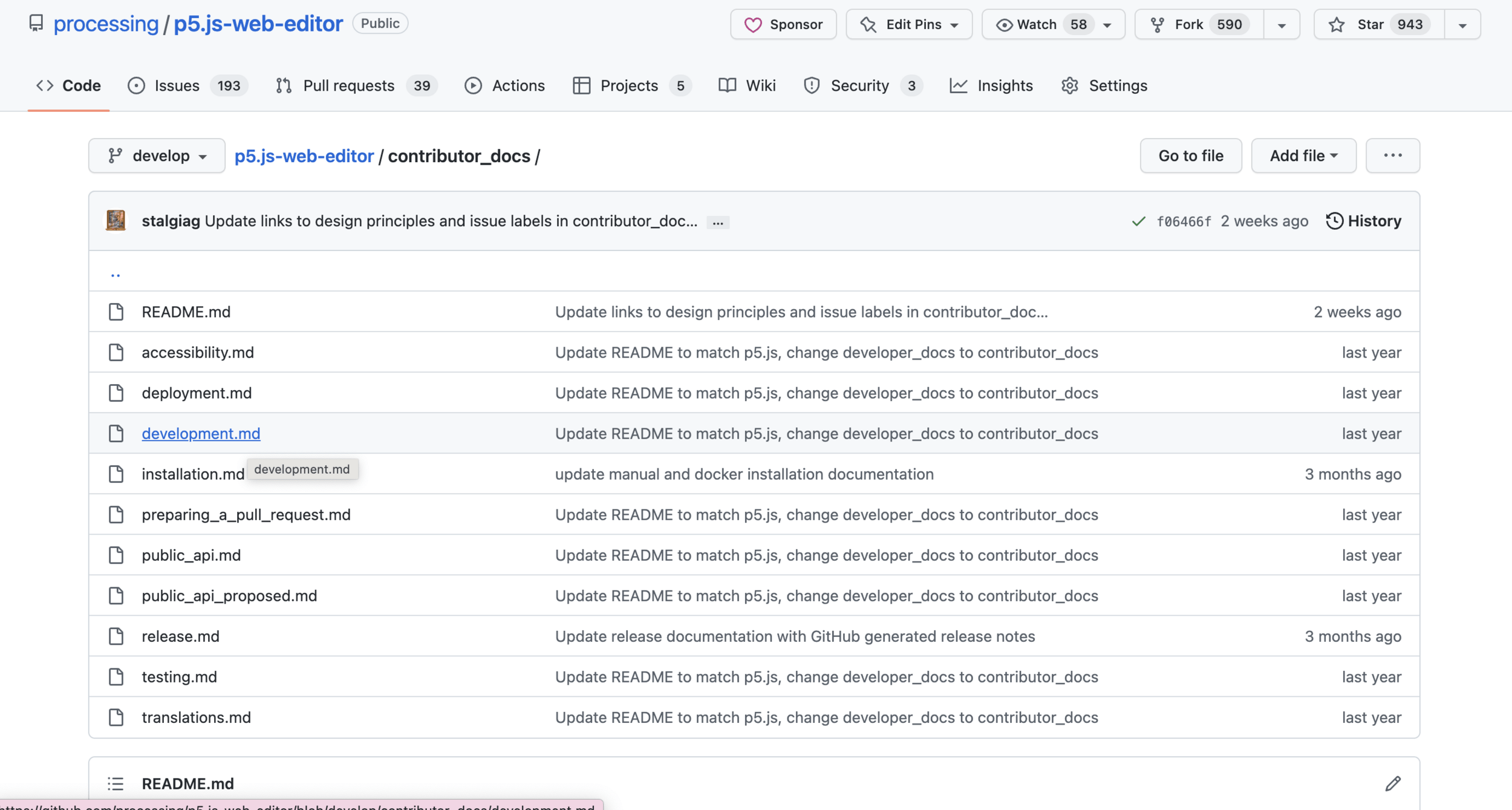 The README.md file is the standard documentation file for open source projects.
