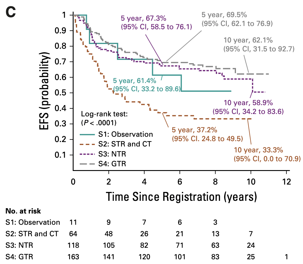 - Maximal safe resection remains crucial: Extent of resection impacts outcome (68.5% 5-year EFS for NTR/GTR vs. 37.2% for STR)