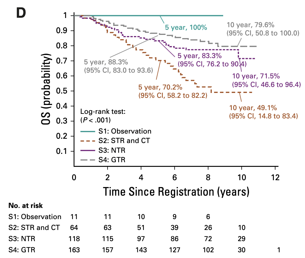 - Observation may be reasonable for select patients: Completely resected classic supratentorial ependymoma had 100% OS with observation