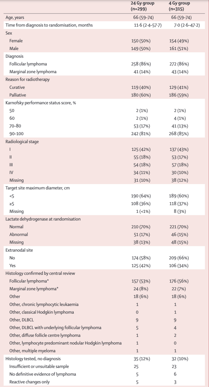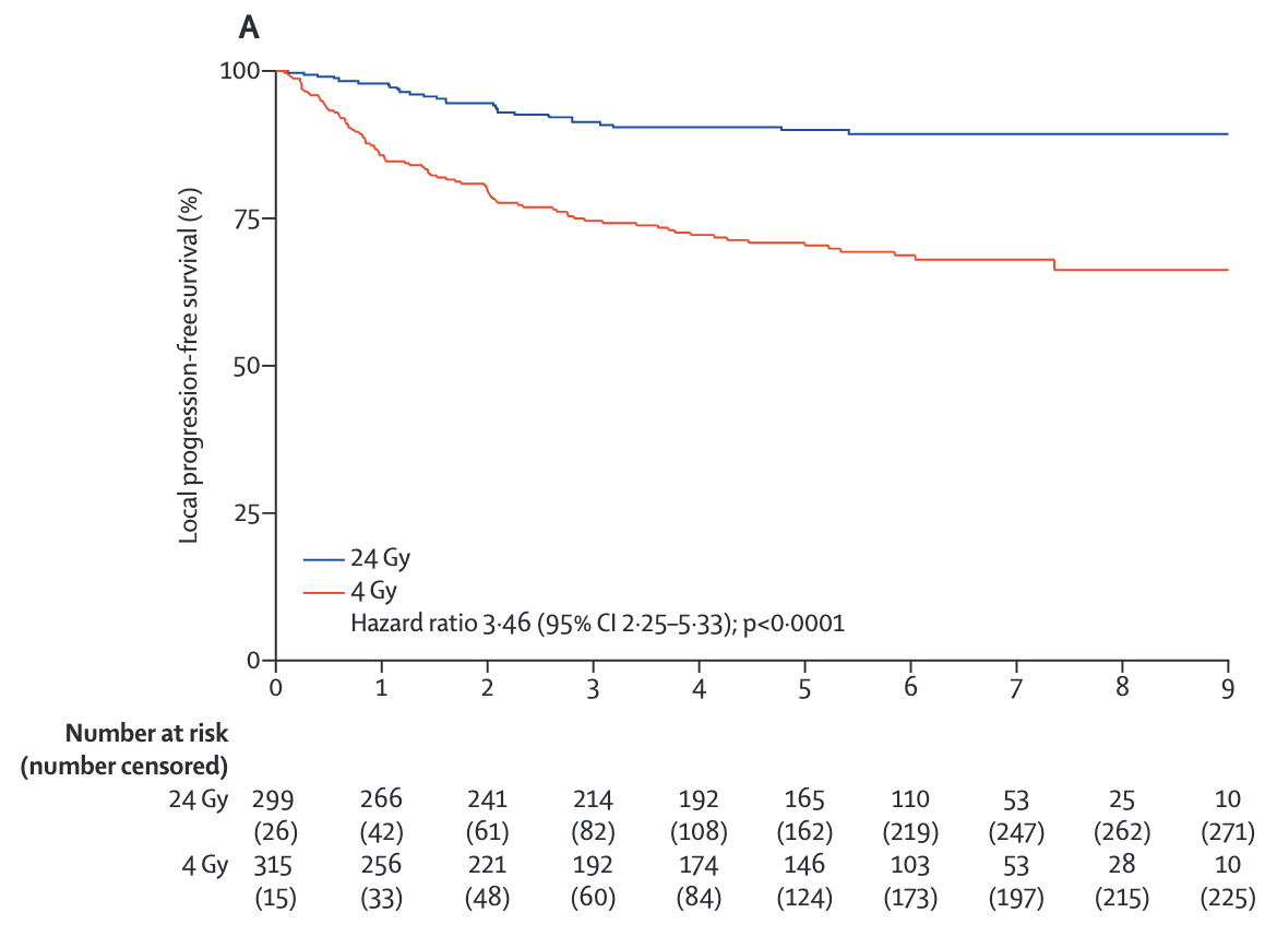 | Characteristic | 24 Gy (n=299) | 4 Gy (n=315) |
