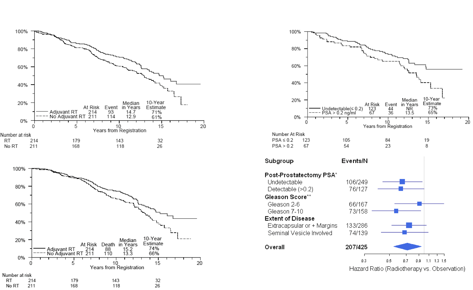 5-yr BPFS 72% RT vs. 54% P=0.0015 10-yr BPFS 56% vs. 35% No change in OS or DM Unknown how many received delayed salvage 10-yr toxicity: only one grade 3 late toxicity of GI. There were 3 grade 2 GU and 2 grade 2 GI. |