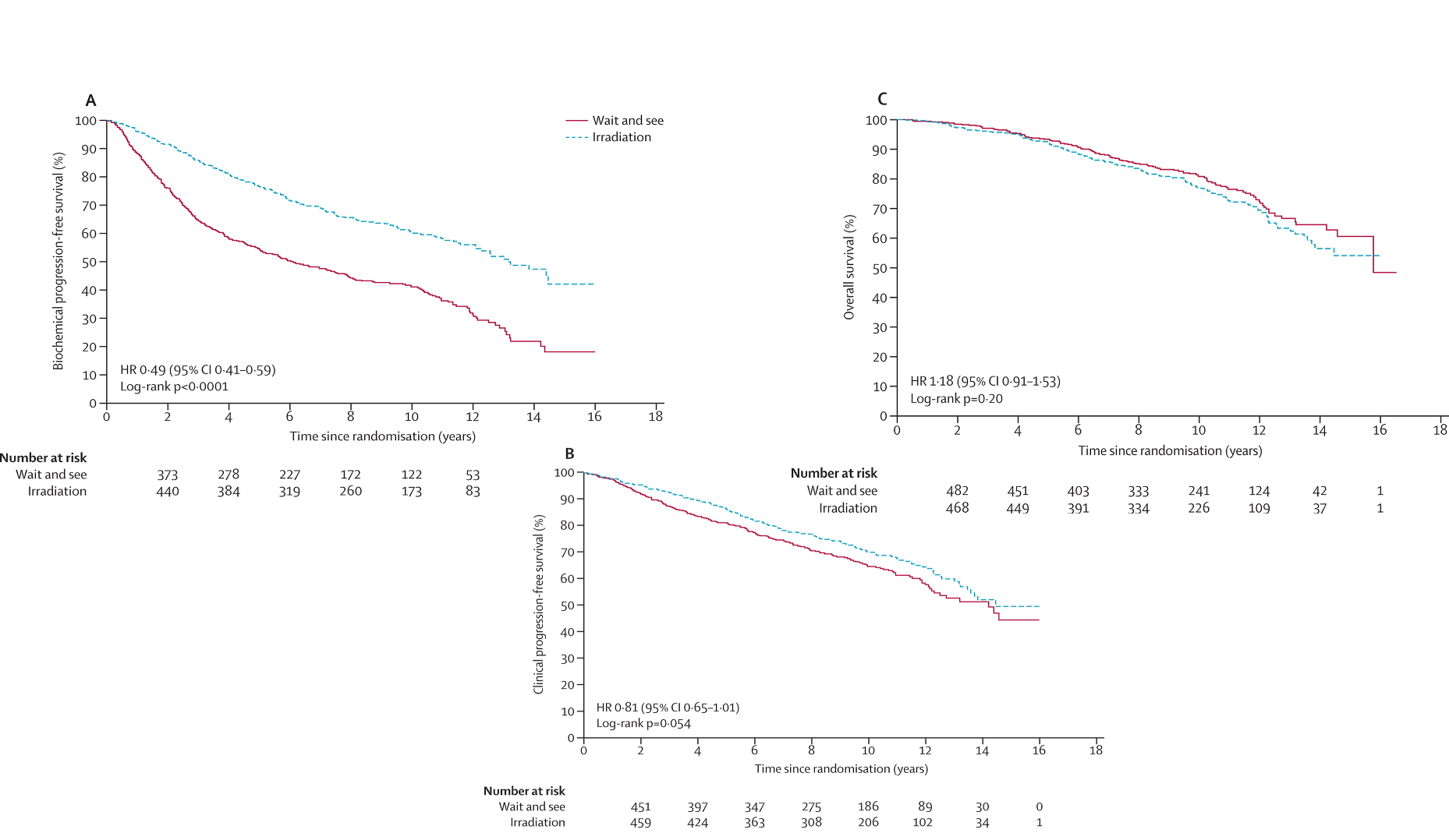 | Results | 10-yr BPFS 58% vs. 28% OS and DMFS change seen at 15 years 10-yr OS 66% vs. 74% 15-yr OS 37% vs. 47% 15-yr DMFS 38% vs. 46% 10-yr toxicity: rectal complications 3% vs. 0% urethral strictures 18% vs. 9% urinary incontinence 6% vs. 3% |
