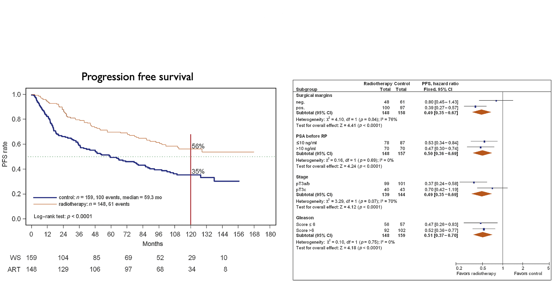 | Results | 10-yr FFP: improved 46% vs. 30% 12-yr OS improved 76% vs. 71% 12-yr DM 14.5% vs. 23.0% 12-yr PC death 6% vs. 13% No OS or DM benefit in PSA ≤0.6 OS benefit in PSA <0.7 with high Decipher score Late grade 3-4 GI toxicity similar at 7% Late grade 3-4 GU toxicity similar, 2.7 vs 1.6% |