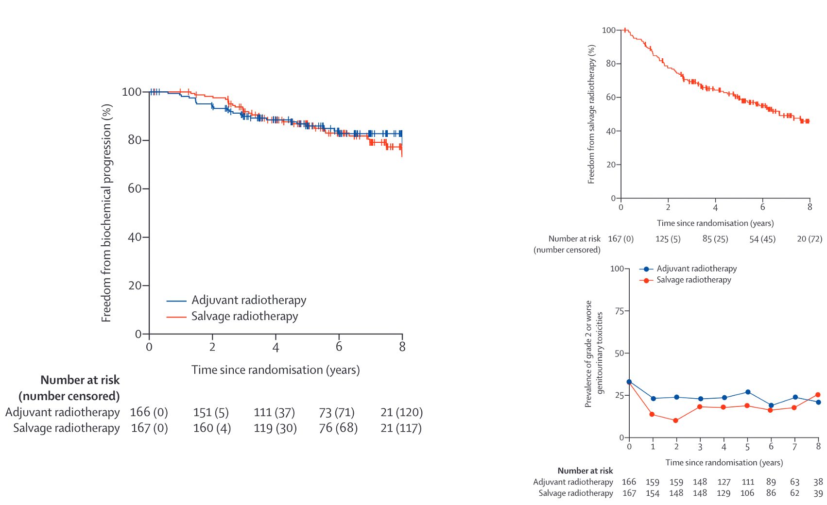 8-yr BPFS not different between adjuvant and salvage RT GU incontinence 5.3% vs. 2.7% (p=0.008) urethral stricture 8% vs. 5% (p=0.03) |