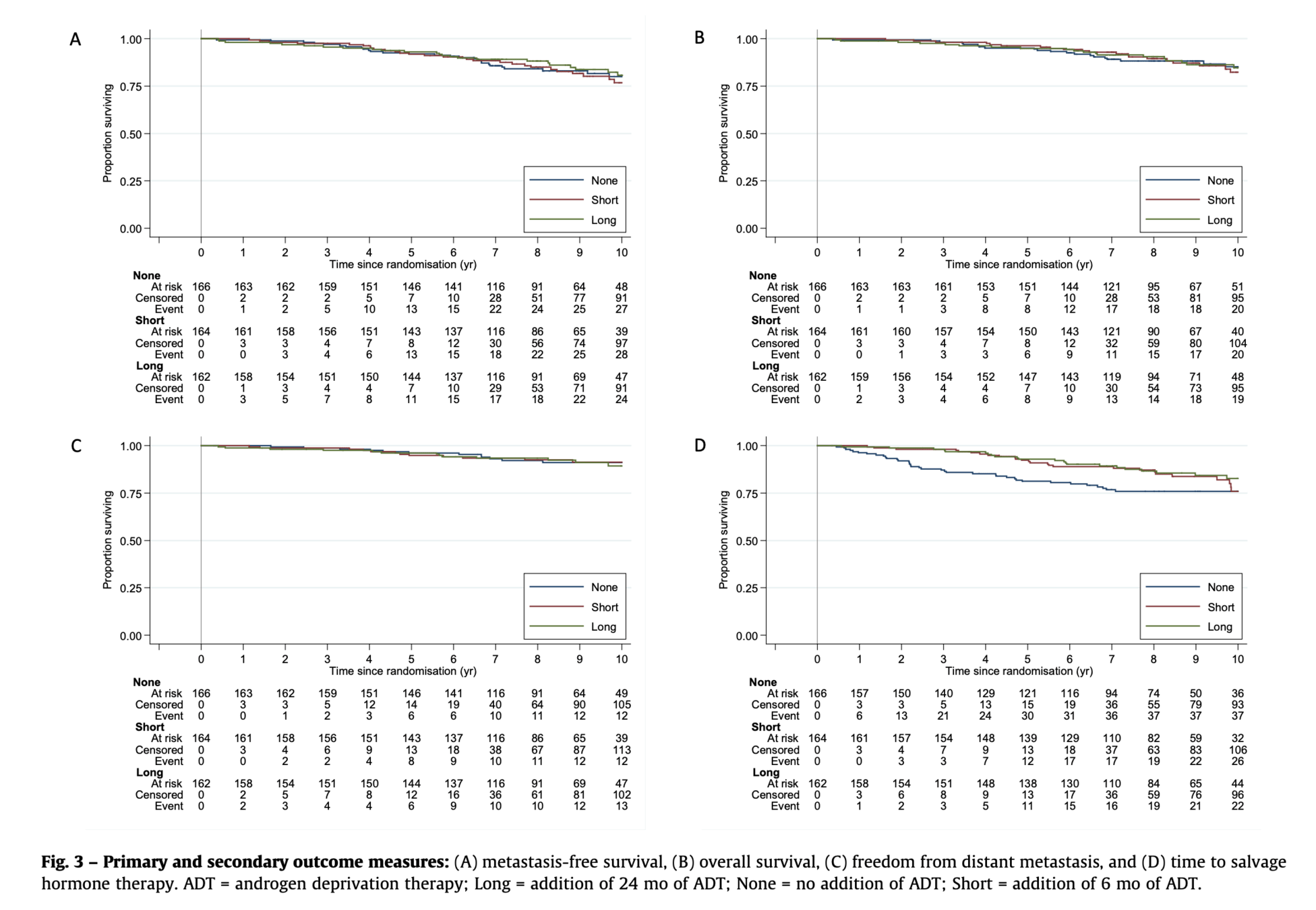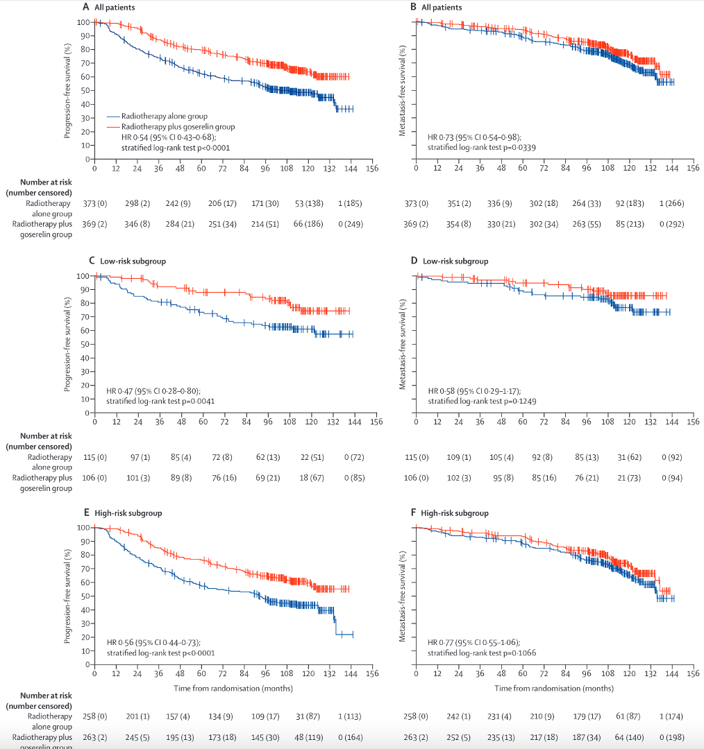 Two 2-way comparisons: →RT vs RT + 6m ADT →RT + 6m vs RT + 24m ADT RT: 66 Gy/33 fx or 52.5 Gy/20 fx |