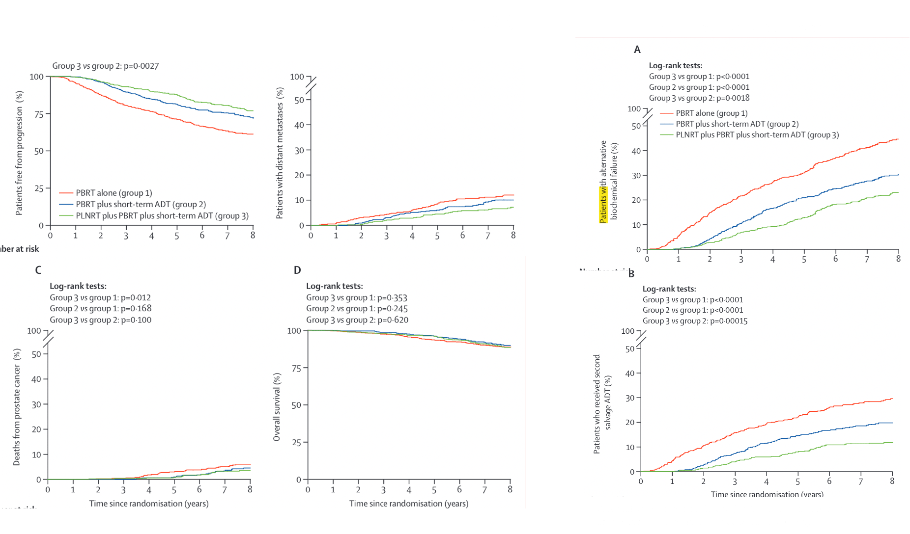 | Results | Salvage RT triggered in 50% 5-yr BPFS 86% vs. 87% (not noninferior) 8-yr BPFS 80% vs. 75% grade ≥2 GU toxicity 70% vs. 54% grade ≥2 GI toxicity 14% vs. 10% Trial terminated early due to low events |