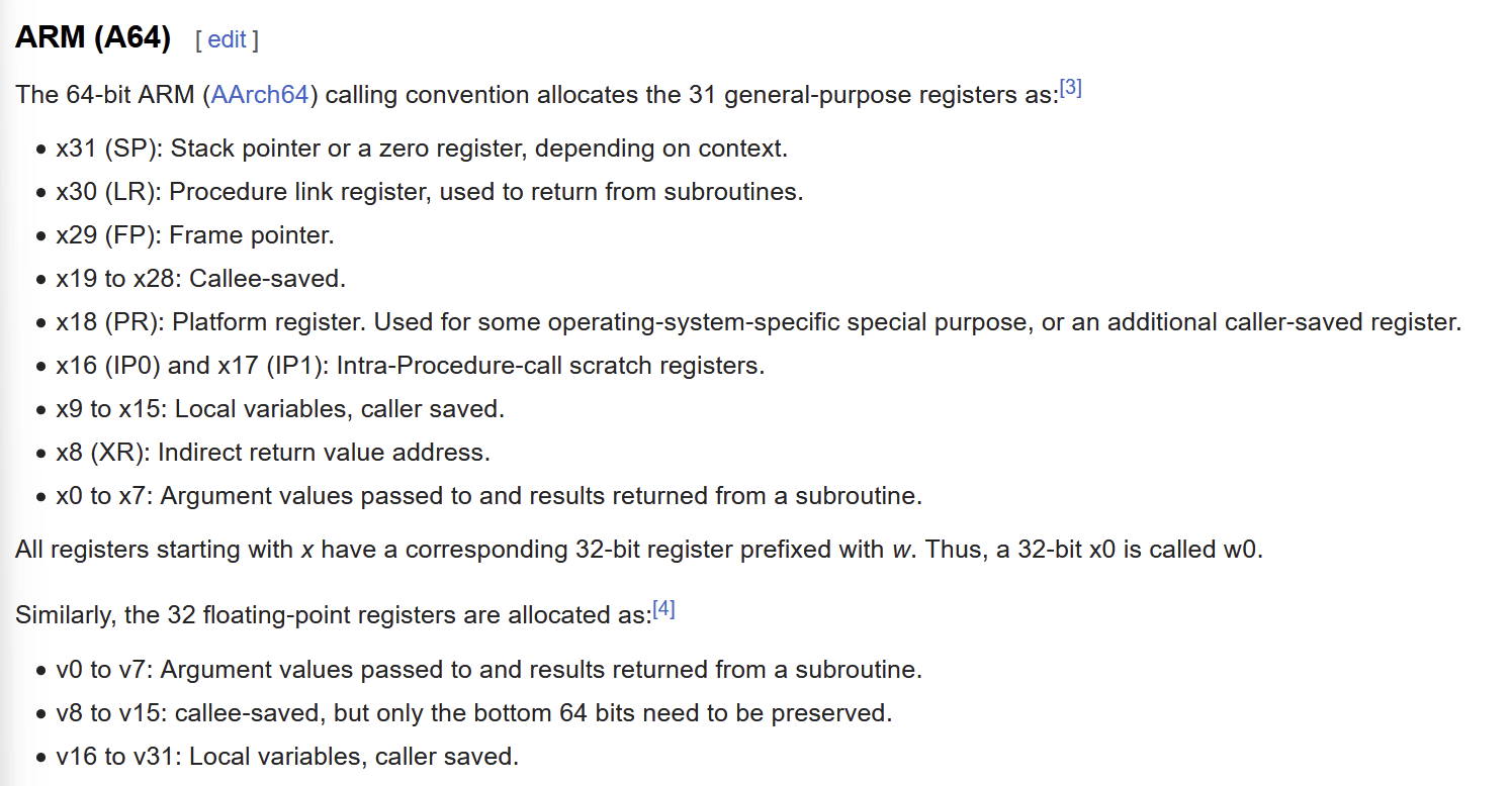 - 64 bit ARM (aarch64) keeps first seven parameters in x0-x7 (v0-v7 for floating point)