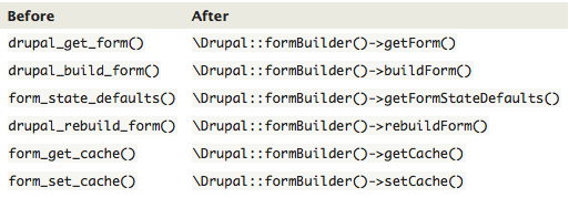 - drupal_*_form functions replaced with formBuilder service. e.g., drupal_get_from => \Drupal::formBuilder()->getForm()