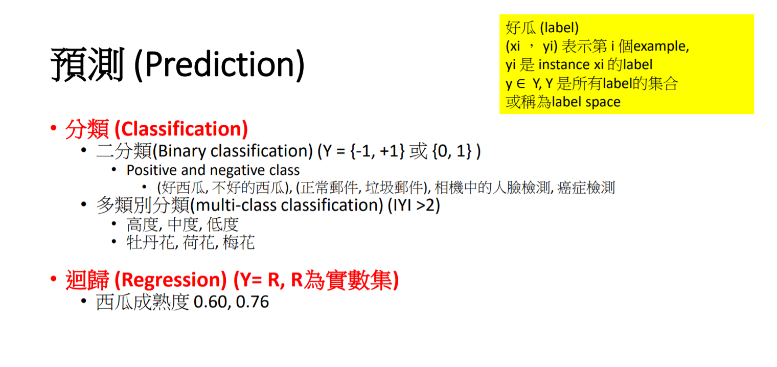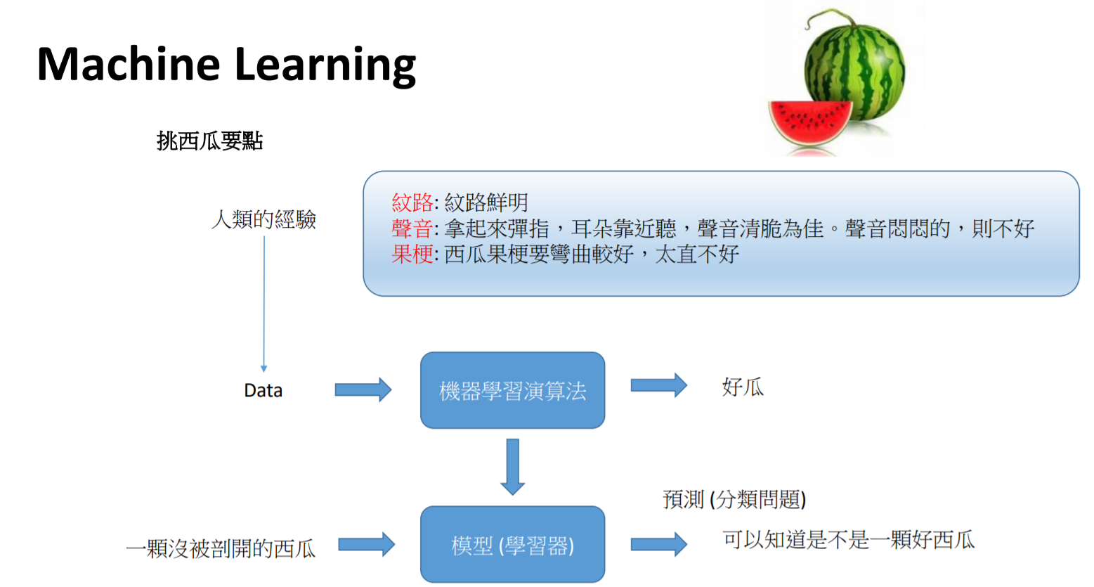 ● 監督式學習(Supervised Learning): 在訓練的過程中告訴機器答案、也就是「有標籤」的資料,比如給機器各看了 1000 張蘋果和橘子的照片後、詢問機器新的一張照片中是蘋果還是橘子。