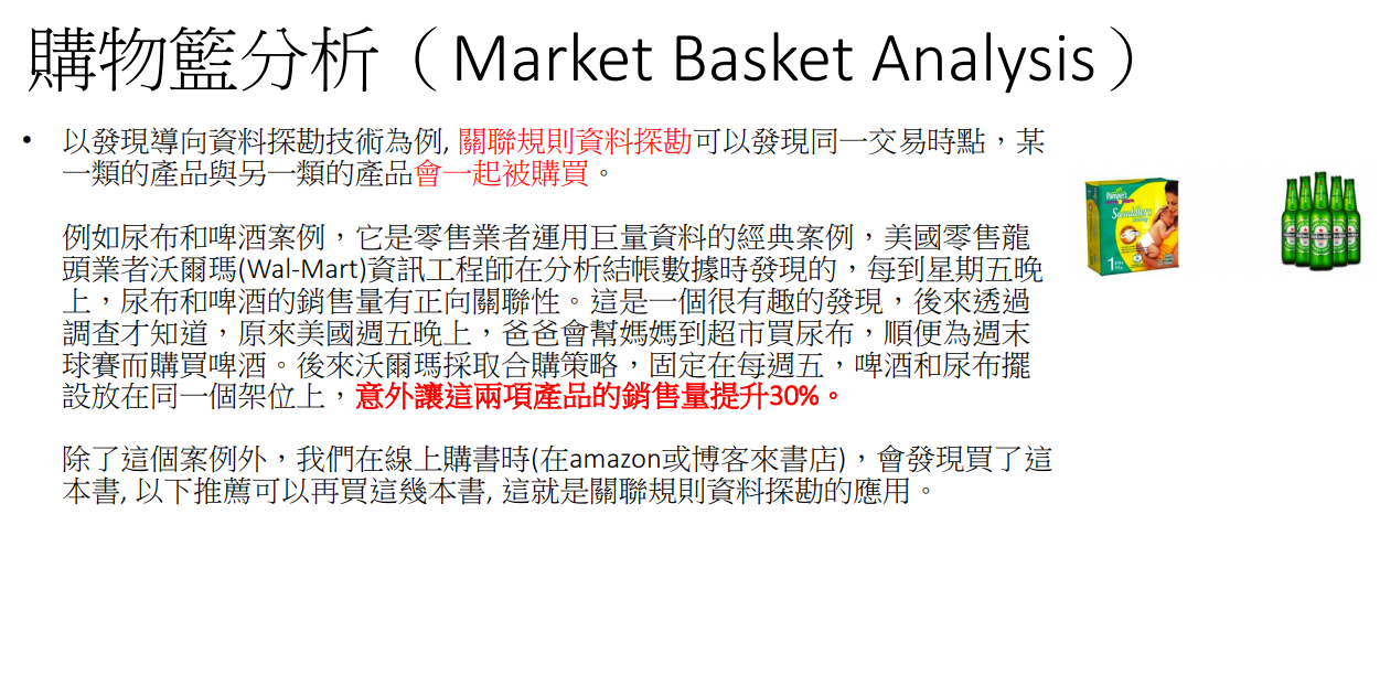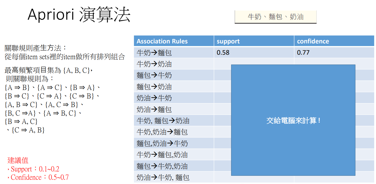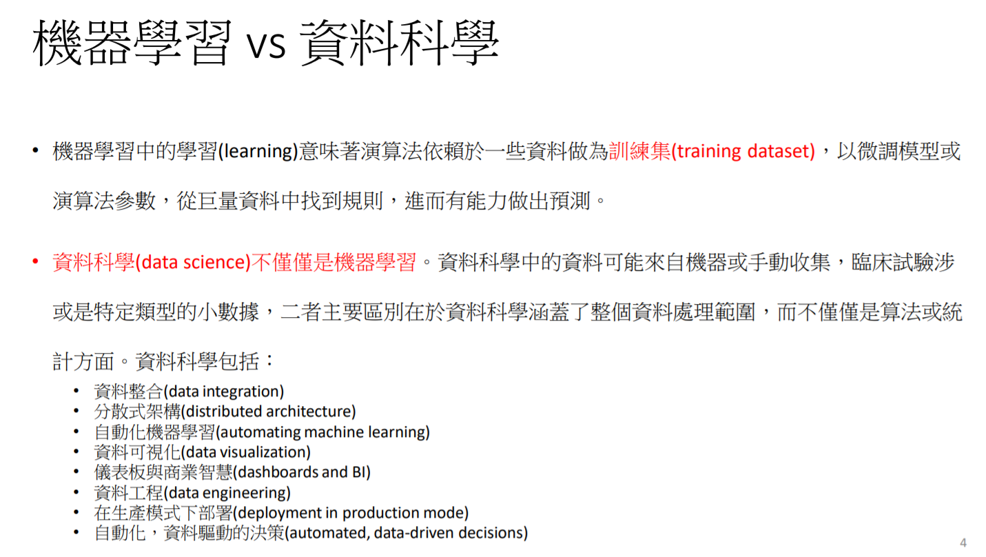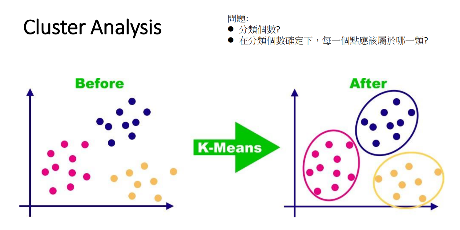 ● 非監督式學習(Unsupervised Learning): 訓練資料沒有標準答案、不需要事先以人力輸入標籤,故機器在學習時並不知道其分類結果是否正確。訓練時僅須對機器提供輸入範例,它會自動從這些範例中找出潛在的規則。