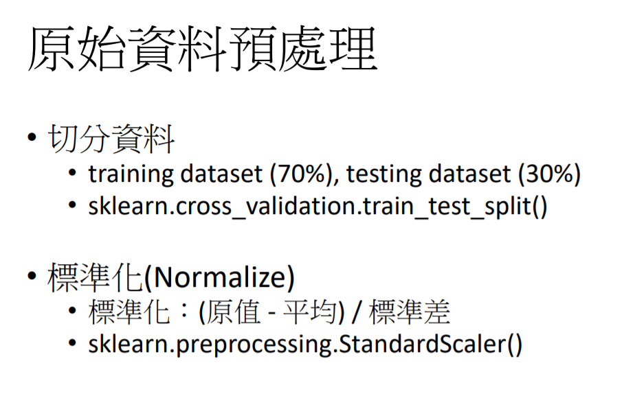 1.原始資料匯入 2.資料集預處理 (特徵工程) 3.資料集探索 4.選擇機器學習演算法 5.模型評估、改善