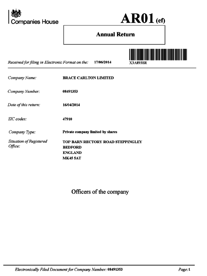 Extract from the companies register (Annual Returns Form) - A document which provides further details on the company including date of establishment, registration data, company name and address and company status