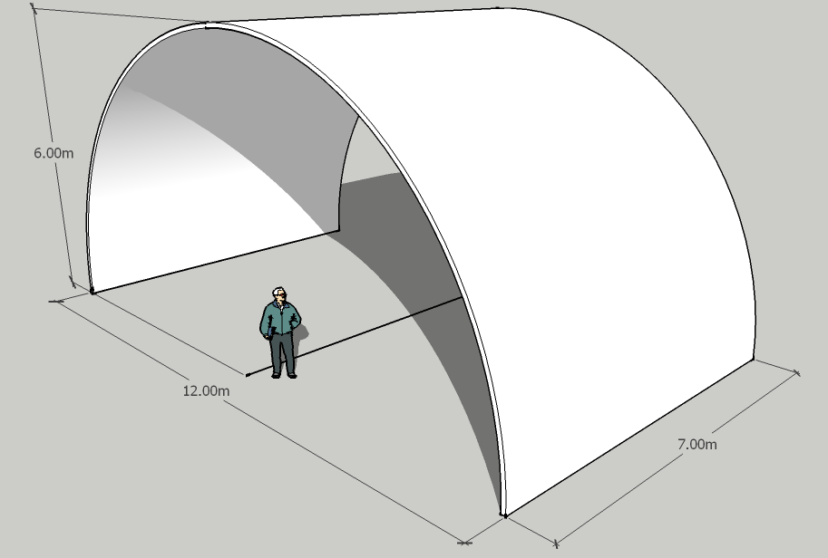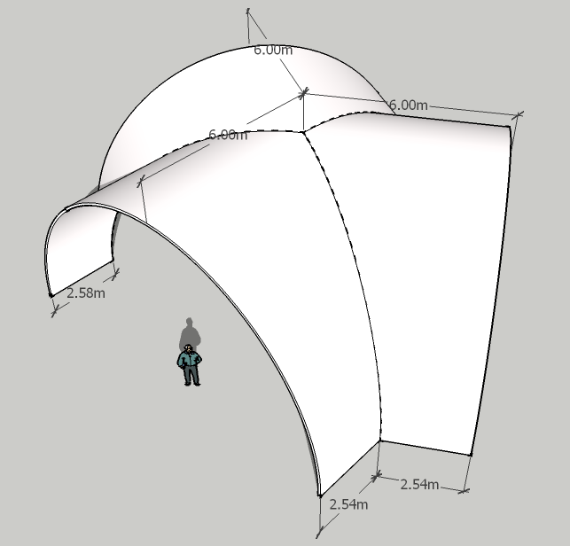 La estructura está compuesta por 3 cáscaras cortas que se intersecan entre sí coincidiendo en un punto central mediante sus generatrices (de 6 m de longitud) con un angulo de 120°