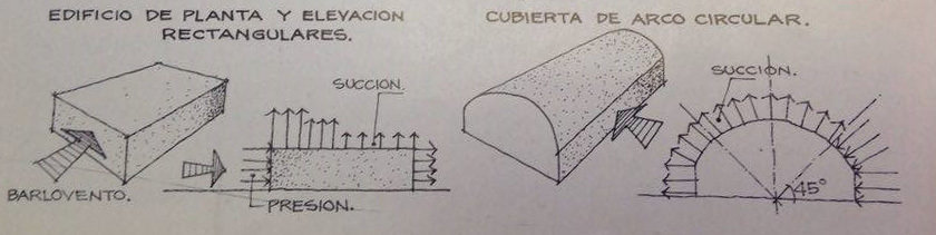 En un edificio aislado, por la zona de barlovento, el viento ejerce presiones, pero en las caras laterales y en la zona opuesta (sotavento) se provocan estados de succión.