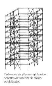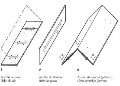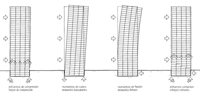 Los componentes de la estructura están sometidos en primer lugar a flexión, es decir, a esfuerzos internos de compresión, tracción y cortantes: Esctructuras en estado de flexión.