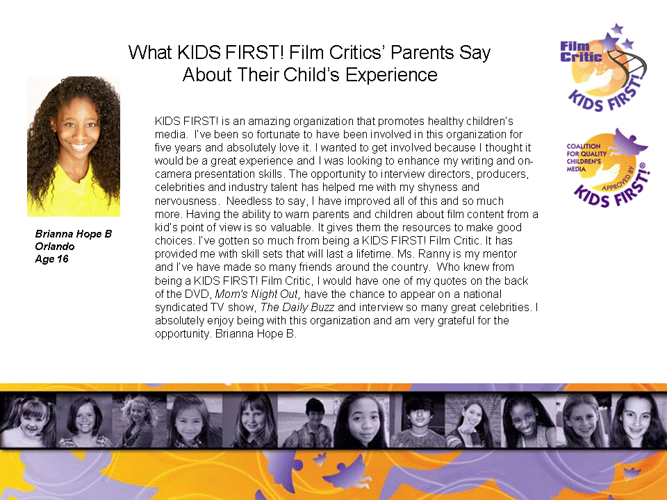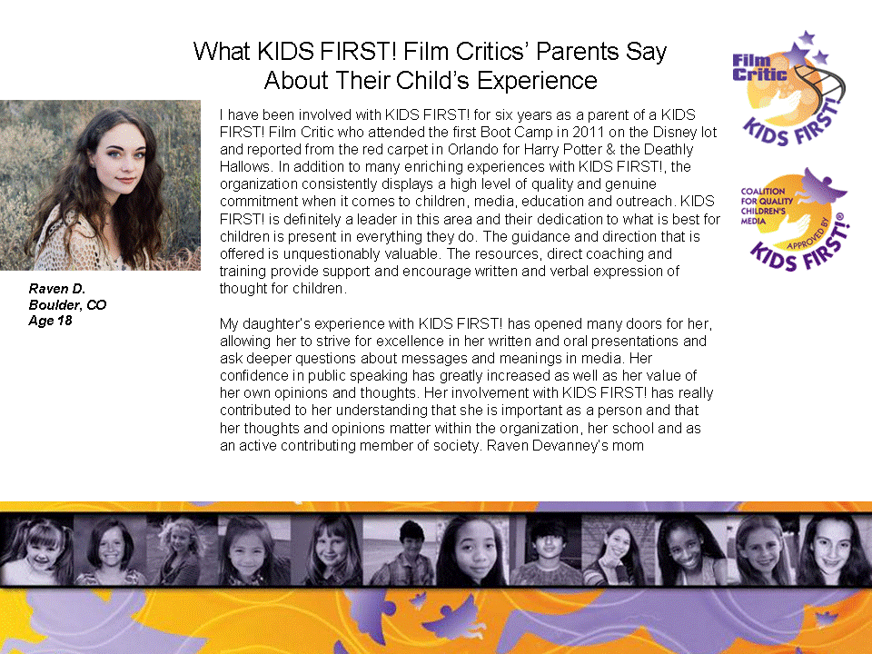 What are the KIDS FIRST! Film Critics? How old? How many? Who sees their reviews? What do they cover? What do they learn? It's media literacy in action - teaching smart kids to be smart consumers.