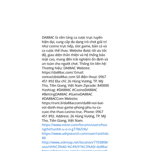 Website: https://rant.li/da88accom/da88-noi-bat-voi-danh-muc-game-phong-phu-tu-ca-cuoc-the-thao-casino-truc. DA88AC là nền tảng ca cược trực tuyến hiện đại, cung cấp đa dạng trò chơi giải trí như casino trực tiếp, slot game, bắn cá và ca cược thể tha