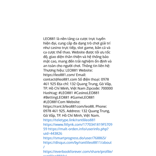 Website: https://rant.li/leo881com/leo88. LEO881 là nền tảng ca cược trực tuyến hiện đại, cung cấp đa dạng trò chơi giải trí như casino trực tiếp, slot game, bắn cá và ca cược thể thao. Website được tối ưu tốc độ, giao diện thân thiện và hệ thống bảo