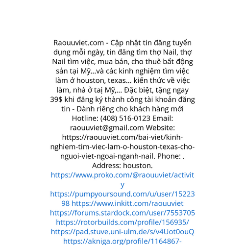 Website: https://raouuviet.com/bai-viet/kinh-nghiem-tim-viec-lam-o-houston-texas-cho-nguoi-viet-ngoai-nganh-nailhttps://raouuviet.com/bai-viet/kinh-nghiem-tim-viec-lam-o-houston-texas-cho-nguoi-viet-ngoai-nganh-nail Raouuviet.com - Cập nhật tin đăng tuyển dụng mỗi ngày, tin đăng tìm thợ Nail, thợ Nail tìm việc, mua bán, cho thuê bất động sản tại Mỹ..