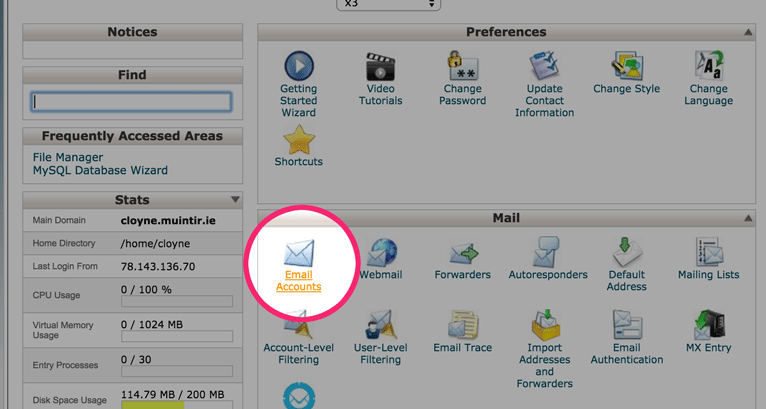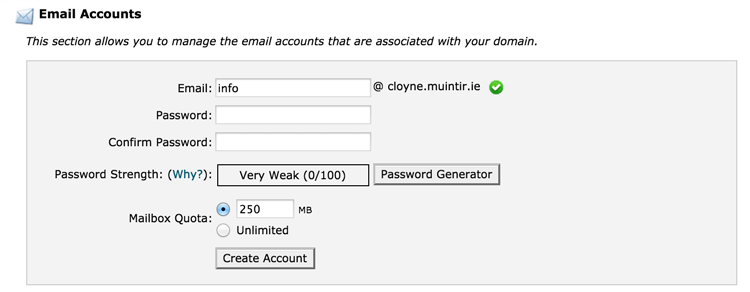 Create email account: http://xxxx.muintir.ie/cpanel