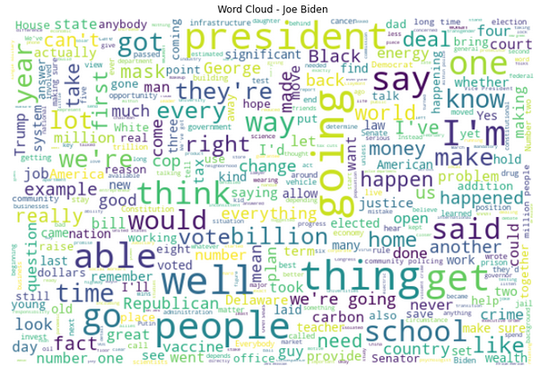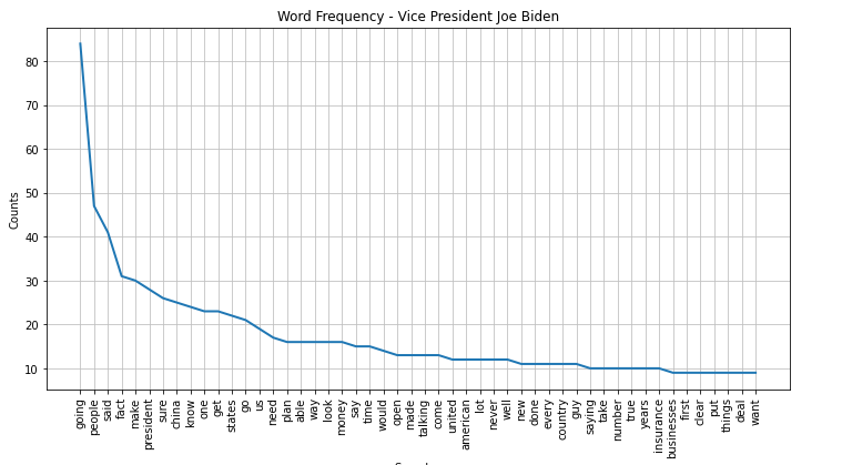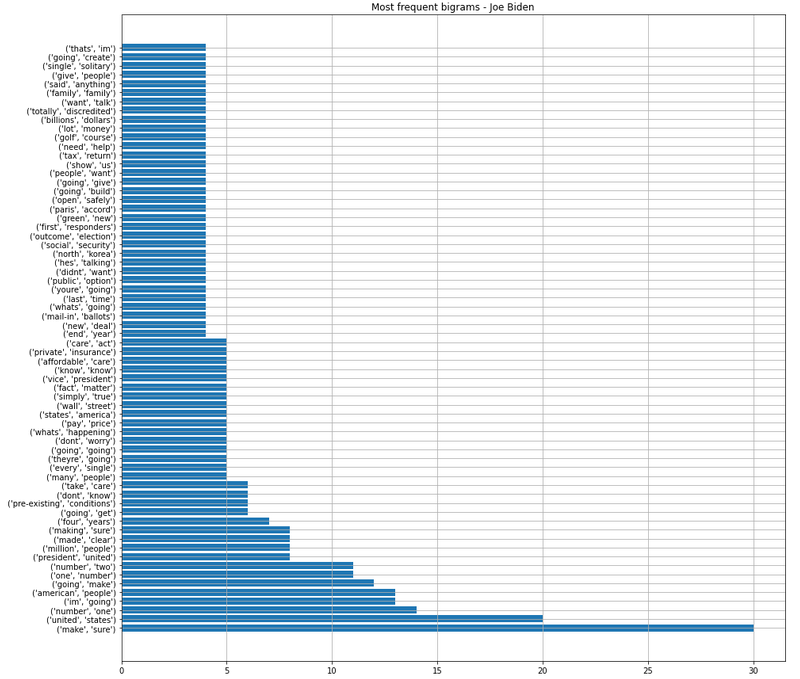 | 1. What were the most prominent words said by each candidate during the different stages of debate during the 2020 and 2016 presidential debates? | Word cloud Bigram |