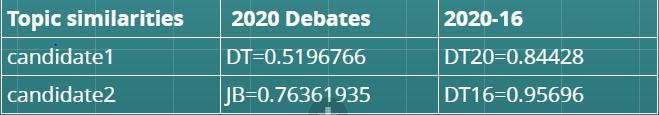 | 6. How does the similarity of the candidate’s speech compare to the other candidate on the same topic? | TF-IDF, LDA model |