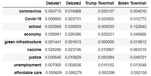 | 5. Which topics were discussed during the 2020 Presidential debates? | TF-IDF, Cosine similarity |