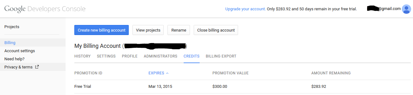 Your trial ends once 60 days have elapsed or you've spent $300. The amount of credit and days remaining are displayed in your console.