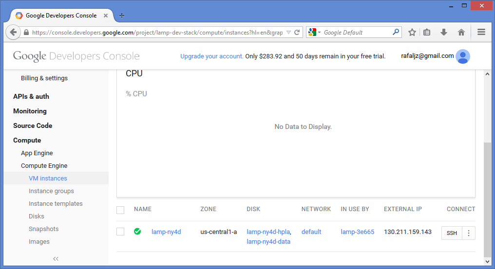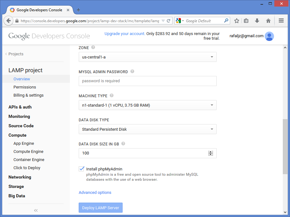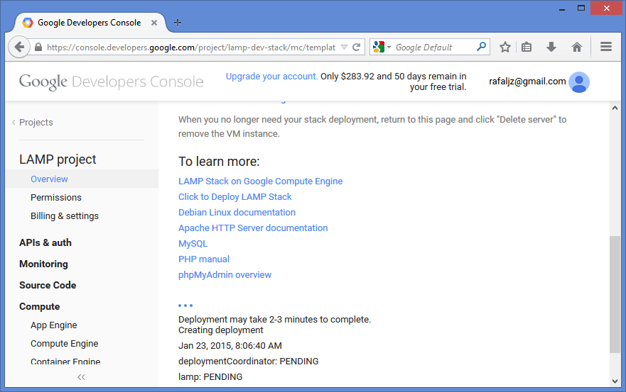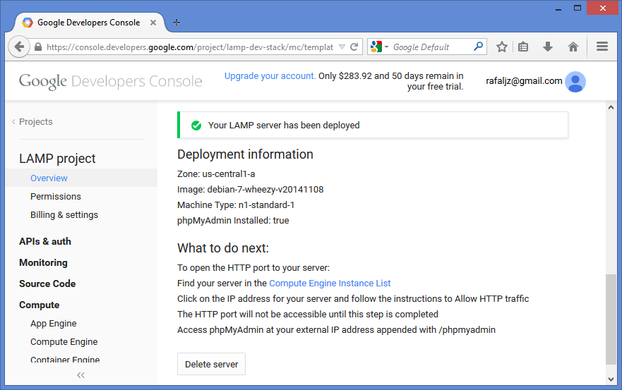 By default, the completed deployment includes one development server (virtual machine instance) with the LAMP stack installed: