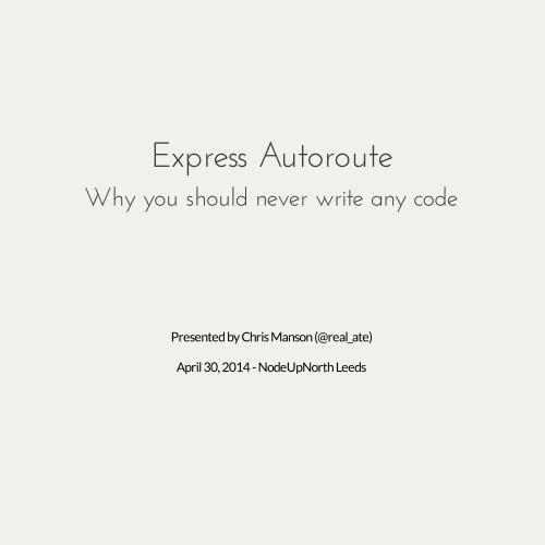 This talk will outline why we created Autoroute and how you can use it to clean up your Express Apps. I’ll also go into why we like Convention over Configuration and how having highly opinionated libraries really helps development on any size of team.