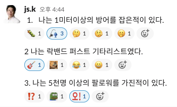 - 참여자들의 개인적인 사실 중 진짜 2가지와 가짜 1가지를 찾아 적게 한다.