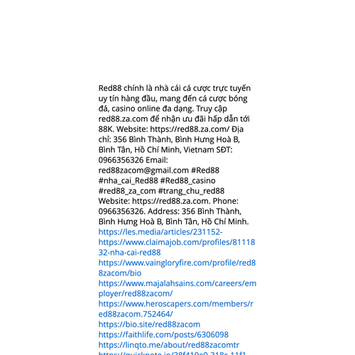 Website: https://red88.za.comhttps://red88.za.com Red88 là nhà cái cá cược trực tuyến uy tín hàng đầu, chuyên cung cấp cá cược bóng đá, casino online đa dạng. Đăng nhập red88.za.com nhận ngay thưởng giá trị tới 88K. Website: https://red88.za.com/ Địa chỉ: 356 Bình Thàn