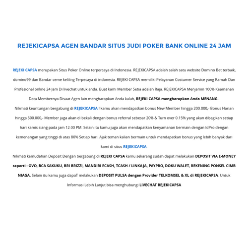 REJEKI CAPSA merupakan Situs Poker Online terpercaya di Indonesia. REJEKICAPSA adalah salah satu website Domino Bet terbaik, domino99 dan Bandar ceme keliling Terpecaya di indonesia. REJEKI CAPSA memiliki Pelayanan Costumer Service yang Ramah Dan Profesional online 24 Jam Di livechat untuk anda. Buat kami Member Setia adalah Raja. REJEKICAPSA Menjamin 100% Keamanan Data Membernya Disaat Agen lain mengharapkan Anda kalah, REJEKI CAPSA mengharapkan Anda MENANG.