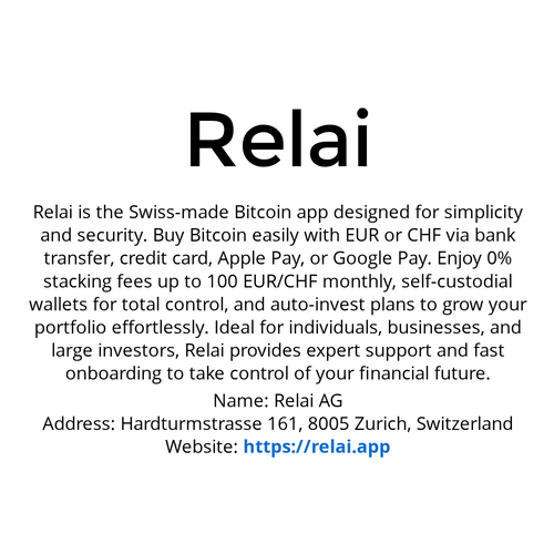 https://relai.app Relai: A Swiss-made app for buying Bitcoin easily & securely. Self-custodial wallets, 0% stacking fees, auto-invest plans, & expert support.