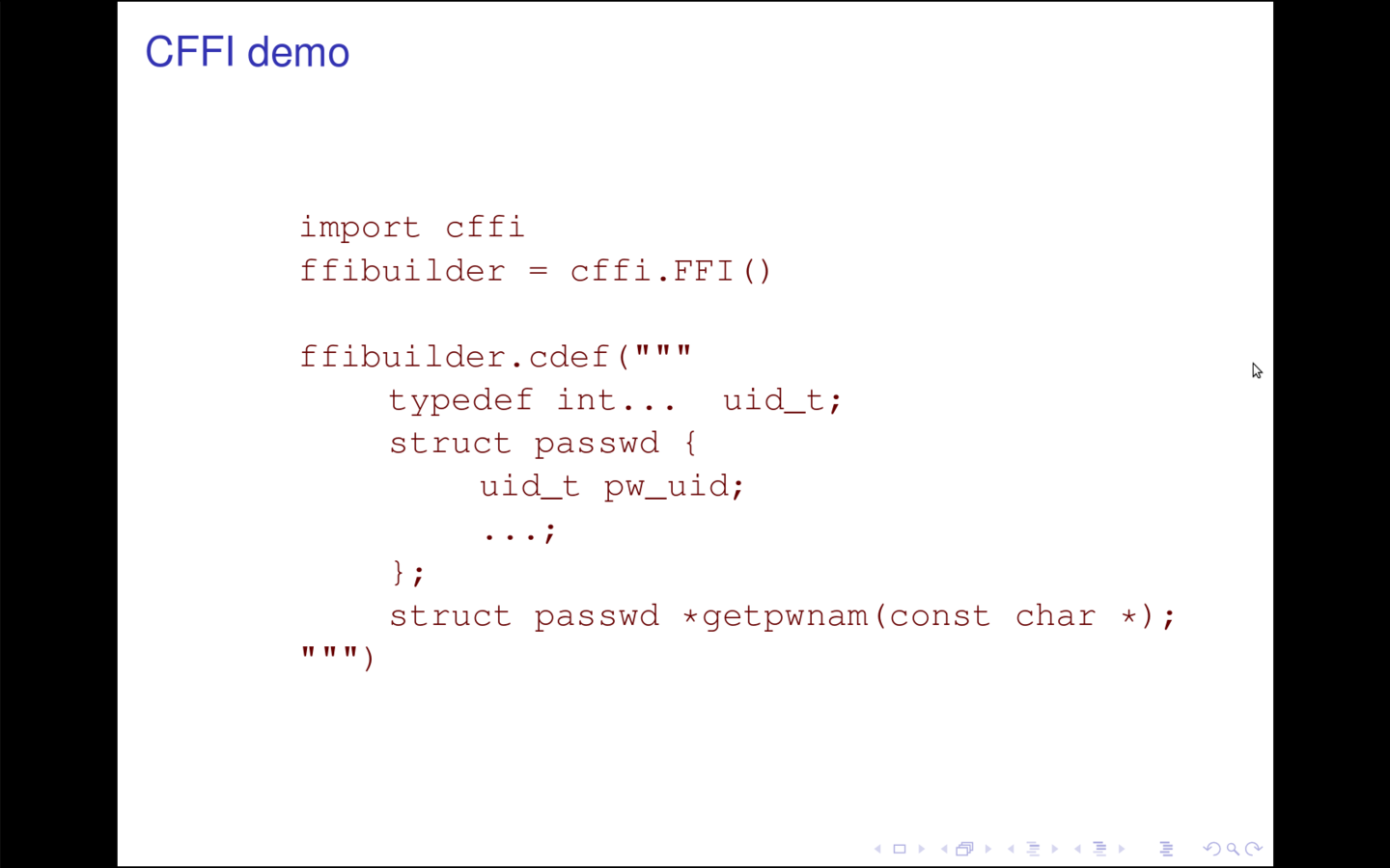using CFFI, you call C functions and manipulate C-pointer-like