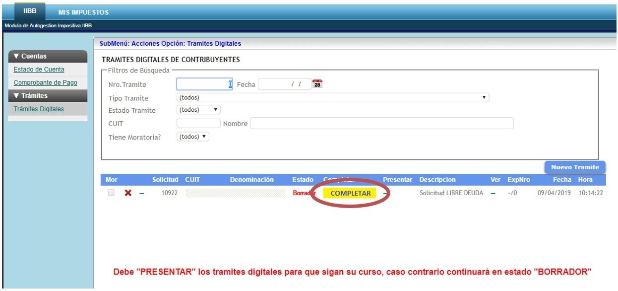 Se podrá visualizar el nuevo trámite generado, el siguiente paso será completar los datos requeridos para esta solicitud, presionando en