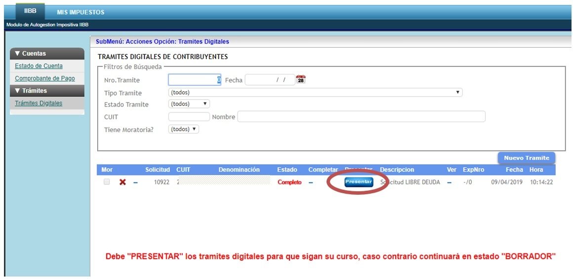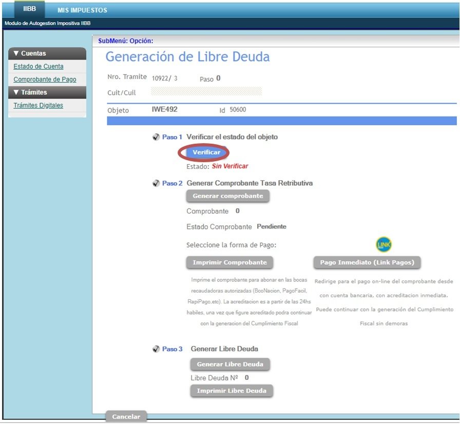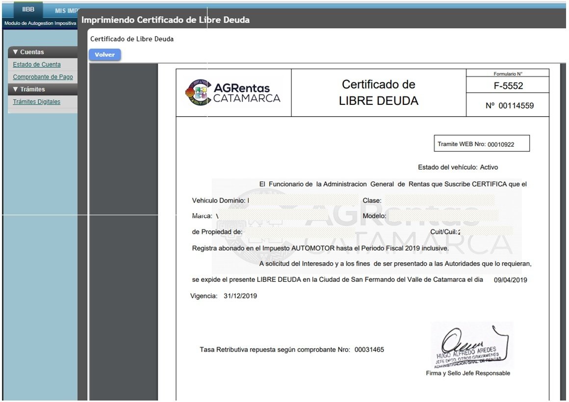 El sistema verificará el estado tributario del Automotor o la Matricula Catastral, por lo que es recomendable verificar el Estado de Cuenta antes de intentar generar el Certificado de Libre Deuda.
