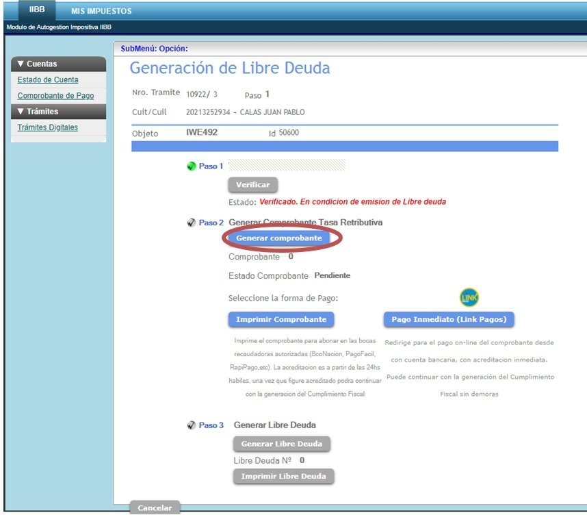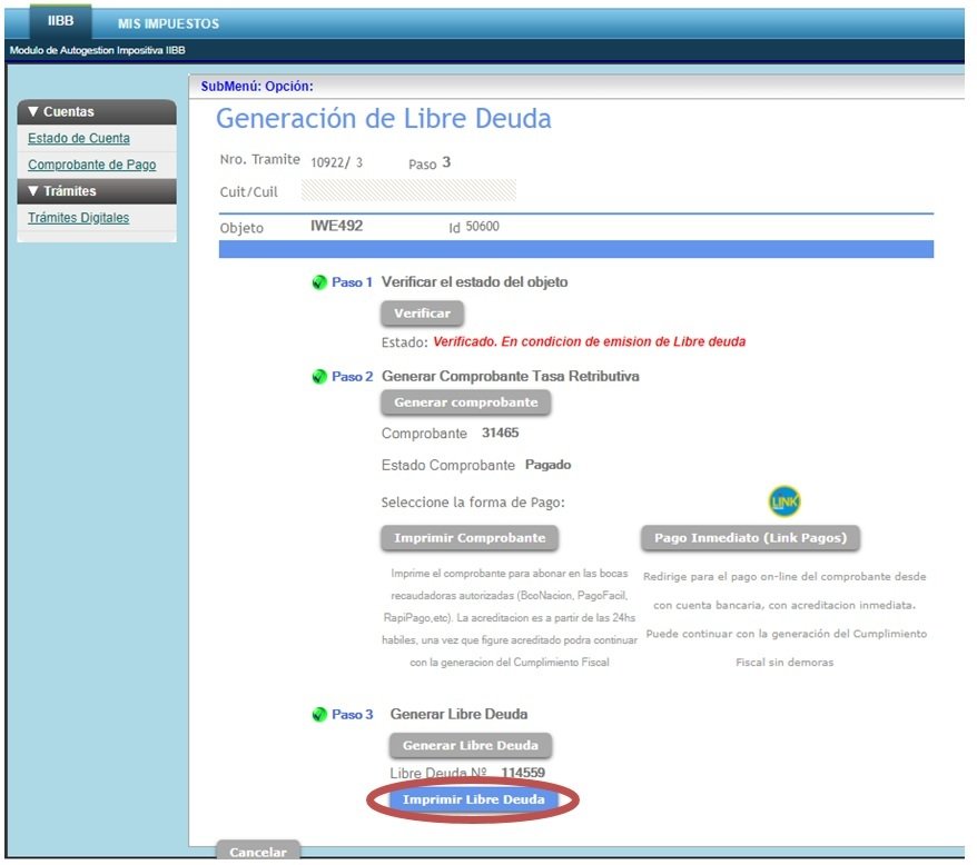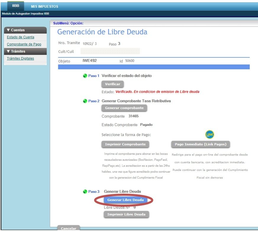Puede continuar con el Paso 3. Generar e imprimir el Libre Deuda. Presione el botón