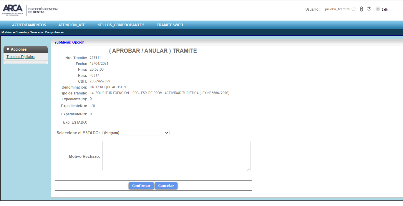 En el caso que el Auditor haya rechazado el trámite, no requerirá ir a los otros módulos, es decir, una vez que haya auditado la documentación que desaprobara la solicitud, irá al WebPanel de Aprobar/Anular Trámite y además de seleccionar el estado deberá explicar detalladamente por qué rechazó el mismo, para que el Contribuyente desde su panel pueda observar el motivo y si es necesario crear otro trámite con las correcciones detalladas que le indicó el Auditor.