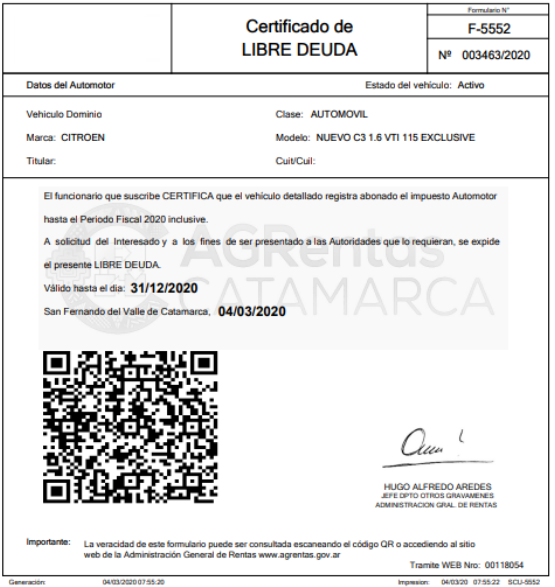 Si está todo en condiciones y el contribuyente se encuentra al día en el impuesto podrá imprimir el siguiente Certificado de Libre Deuda.