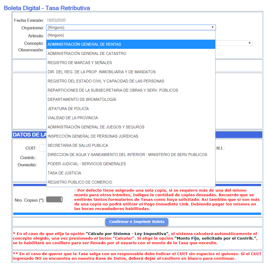 A continuación seleccionar el Organismo del cual se solicita la tasa